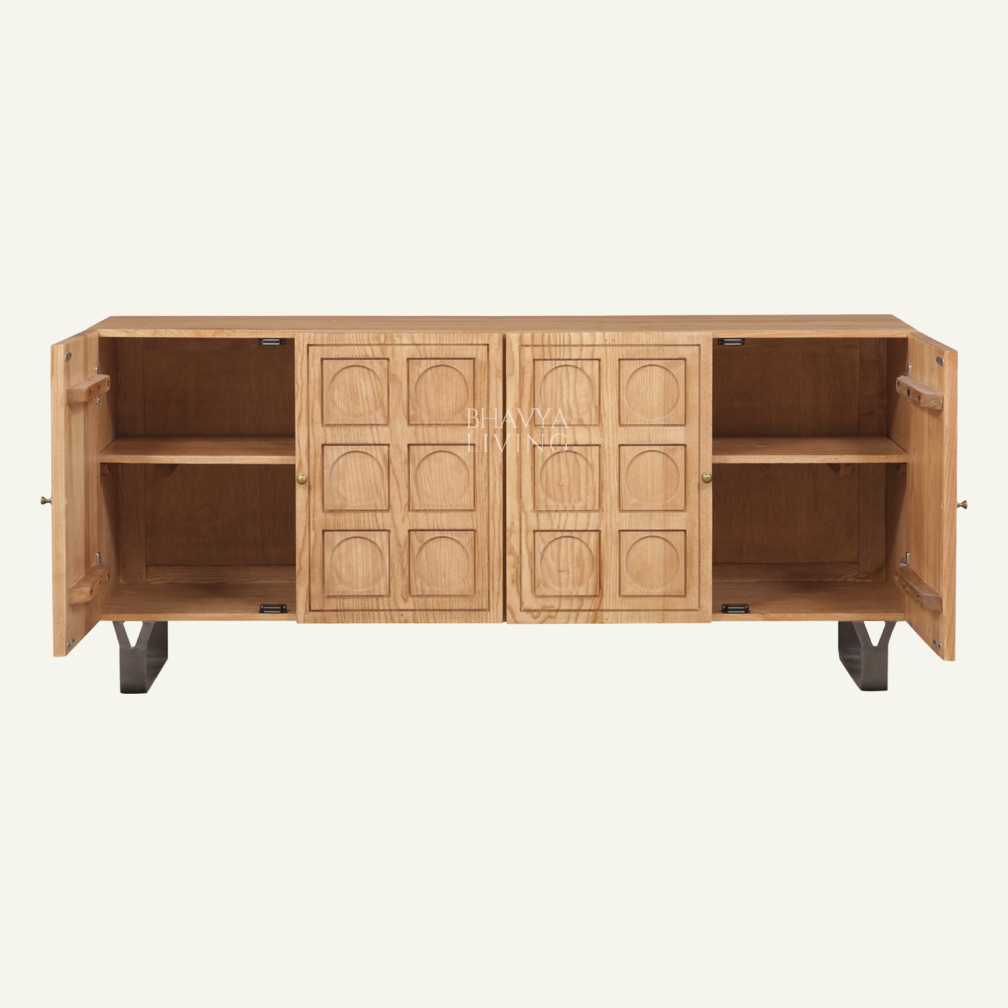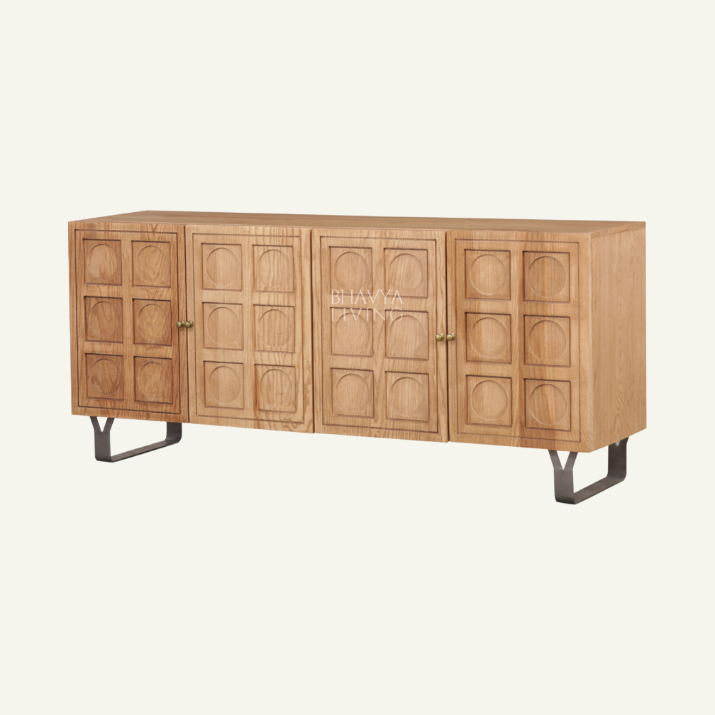 The Haveli Grid Sideboard is a refined storage piece that blends heritage-inspired craftsmanship with a clean, contemporary profile. Featuring beautifully carved grid-pattern doors, it adds texture and depth while maintaining a structured and balanced look. Crafted from solid ash wood, the natural finish highlights the warmth and grain of the wood, complemented by subtle gunmetal-finished legs for a modern contrast. Designed with ample internal storage, it is ideal for organising dinnerware, linens, or everyday essentials in living and dining spaces. Perfect for modern, eclectic, and boutique hospitality interiors, this sideboard brings functionality, craftsmanship, and timeless character to any setting.