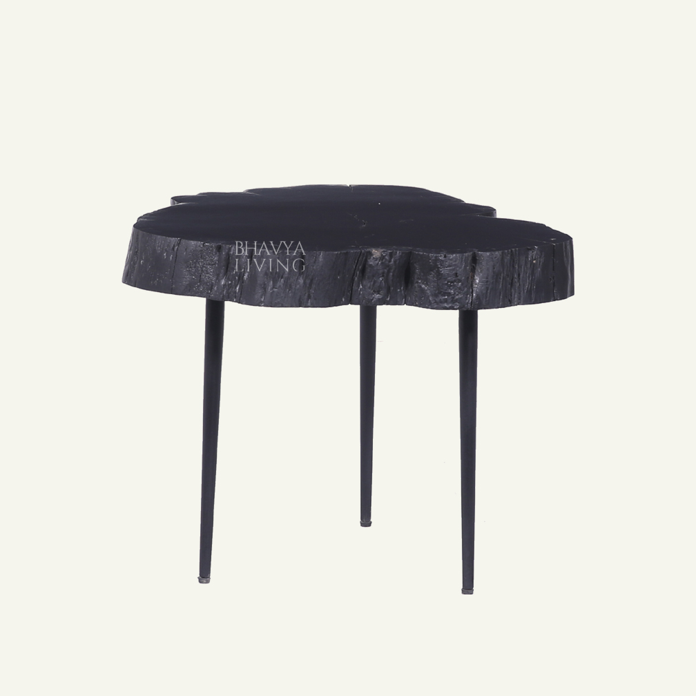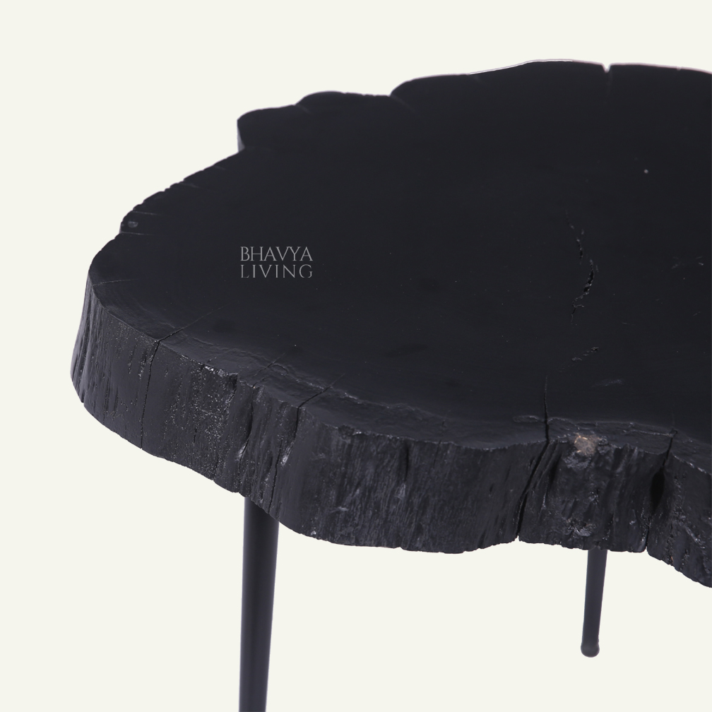 The Obsidian Tripod Side Table is a bold accent piece designed to make a striking statement in contemporary interiors. Featuring a textured round top supported by slender tripod legs, this table combines sculptural form with a clean, minimalist profile. Crafted from wood and iron, the deep black finish enhances its dramatic presence while highlighting the raw texture of the tabletop. Compact and versatile, it works beautifully as a side table, stool, or display stand beside sofas, lounge chairs, or in styled corners. Ideal for modern, industrial, and eclectic spaces, this side table adds depth, contrast, and a refined architectural touch to any setting.